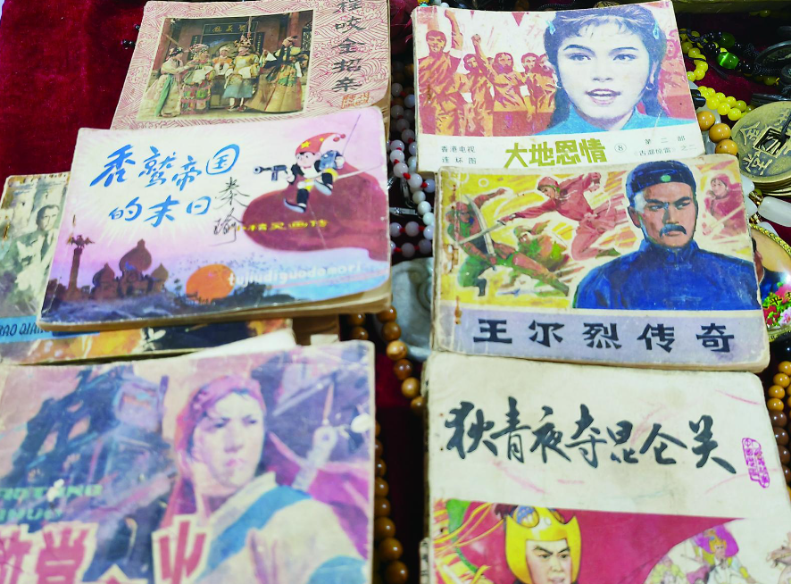 3楼的“陈姐淘宝店”是市场老字号,开了近30年。60多岁的陈孃孃戴着老花镜,坐在玻璃柜台后慢悠悠整理着旧书。她捧出一叠泛黄小人书,《狄青夜夺昆仑关》《王尔烈传奇》,最老的一本《程咬金招亲》,扉页印着“1982年印刷”,纸页已经泛黄,却保存完好。“这些都是从老社区、旧书摊收来的,想让懂它的人带走,让故事传下去。”