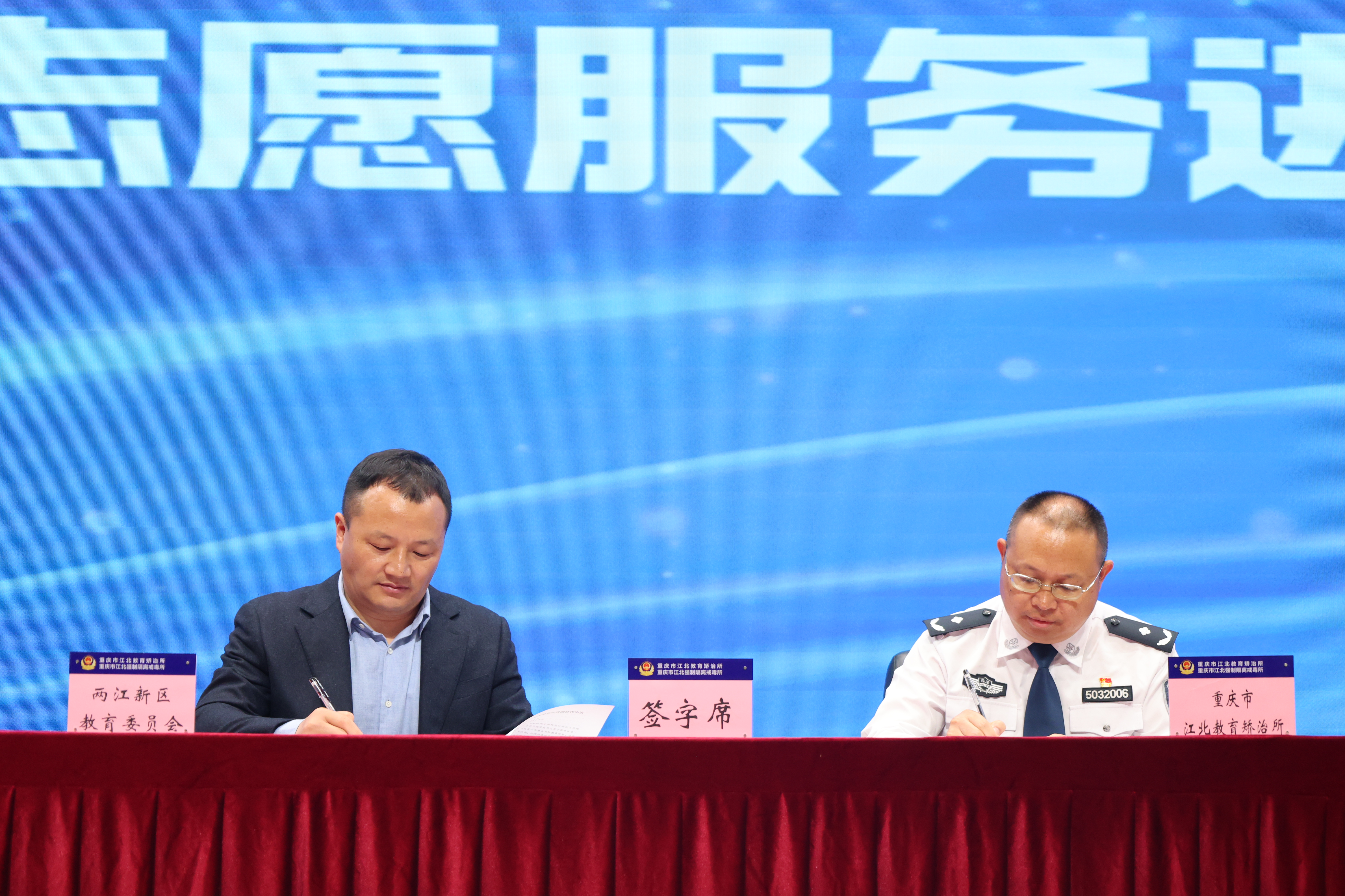 启动仪式上,两江新区教委与江北所正式签订禁毒法治宣传志愿服务进校园合作协议。双方将以守望者禁毒志愿服务队为载体,吸纳戒毒民警、教师及社会各界人士加入志愿者队伍,夯实专业化、常态化宣传力量;同时丰富宣传内容、拓展教育资源、创新传播形式,通过主题宣讲、情景剧、互动体验等多样化方式,全方位筑牢校园禁毒防线。
