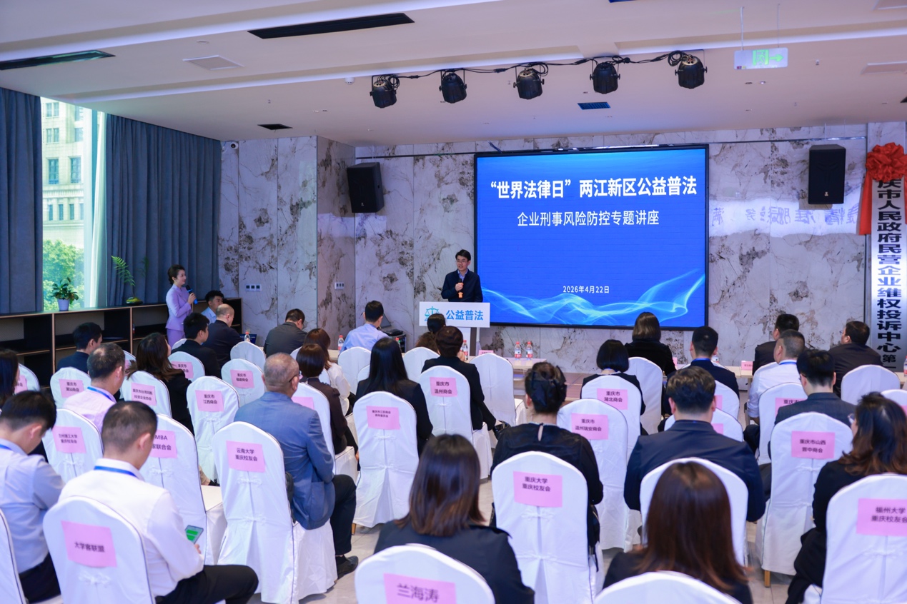4月22日,世界法律日两江公益普法宣传活动在重庆两江新区举行。活动由两江新区区委政法委主办,区公安分局、区检察院、区法院、区司法局共同参与,商会及民营企业负责人等约80人参加。活动以“企业刑事风险防控”为主题,通过专题讲座、互动交流等形式,进一步提升企业依法经营、合规管理与风险防控意识。